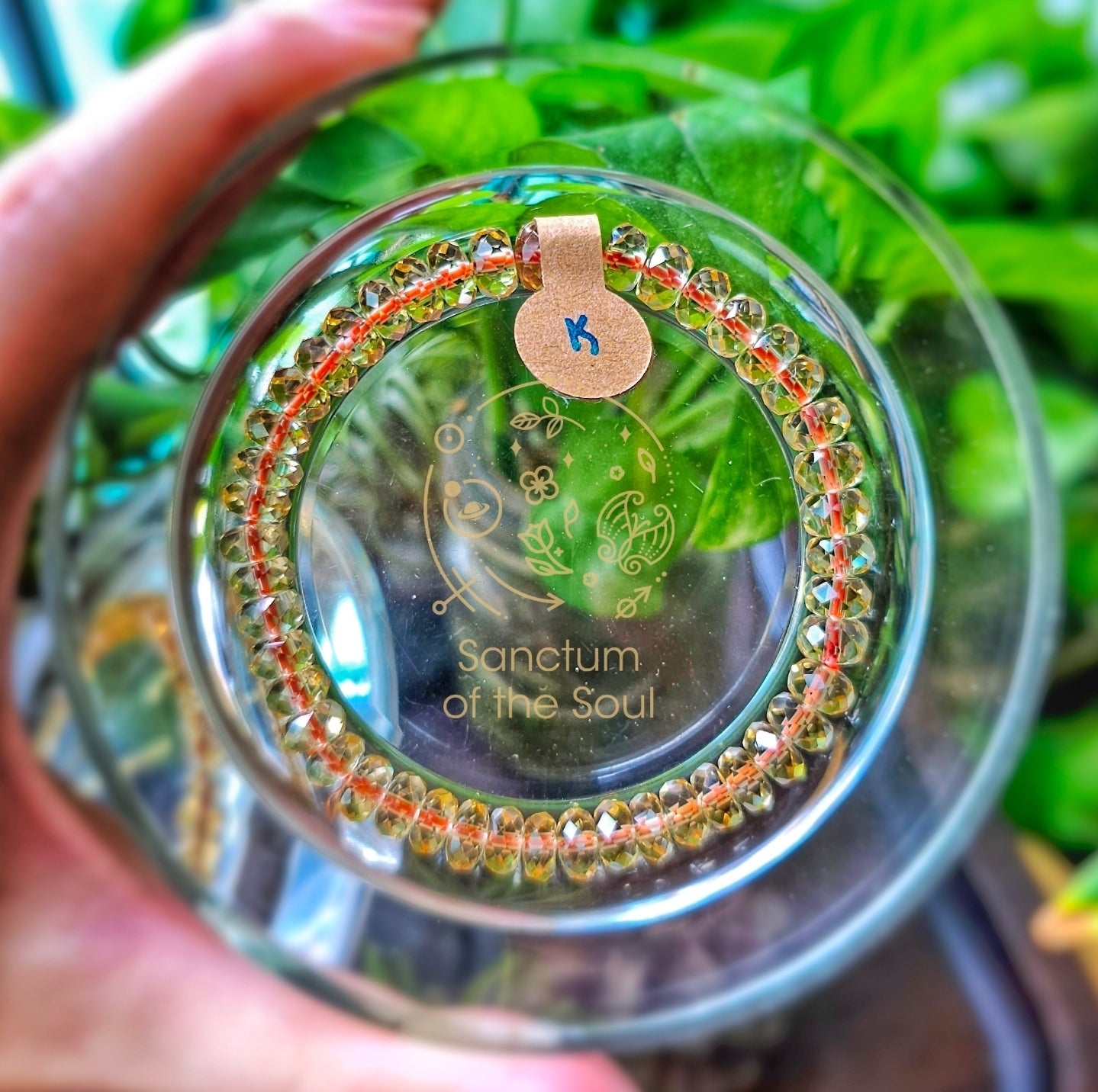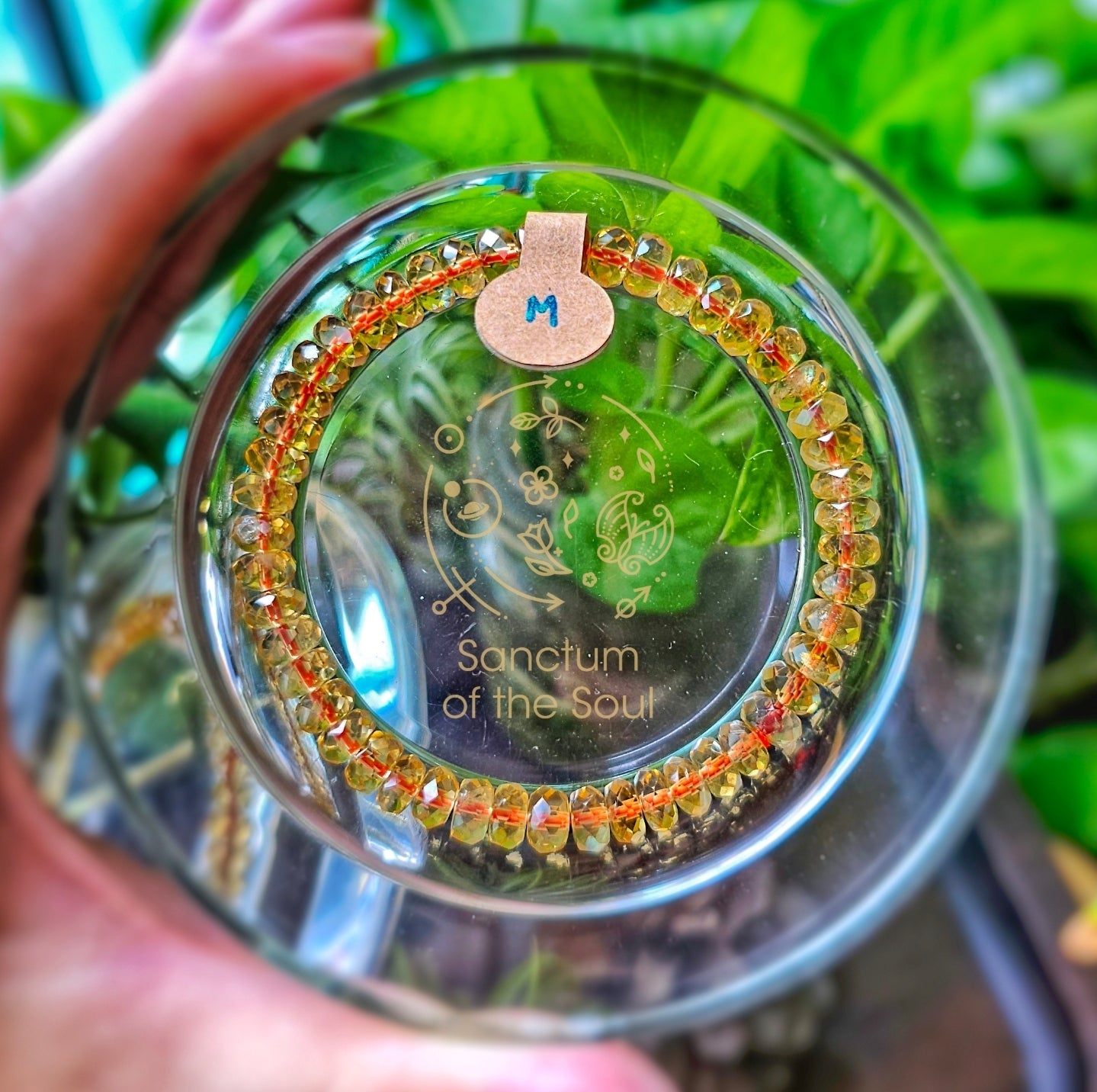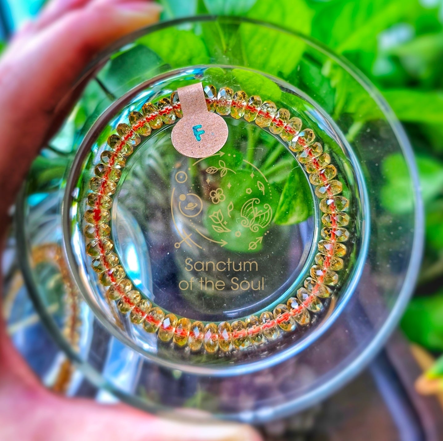 Gem faceted Citrine tied with red string.