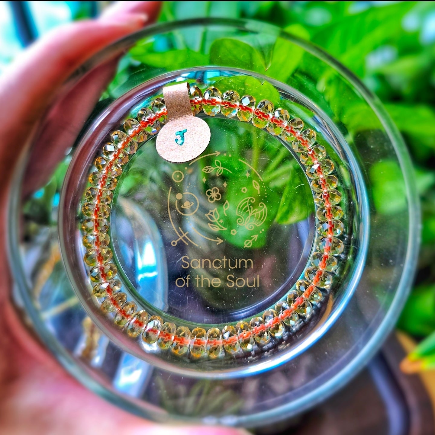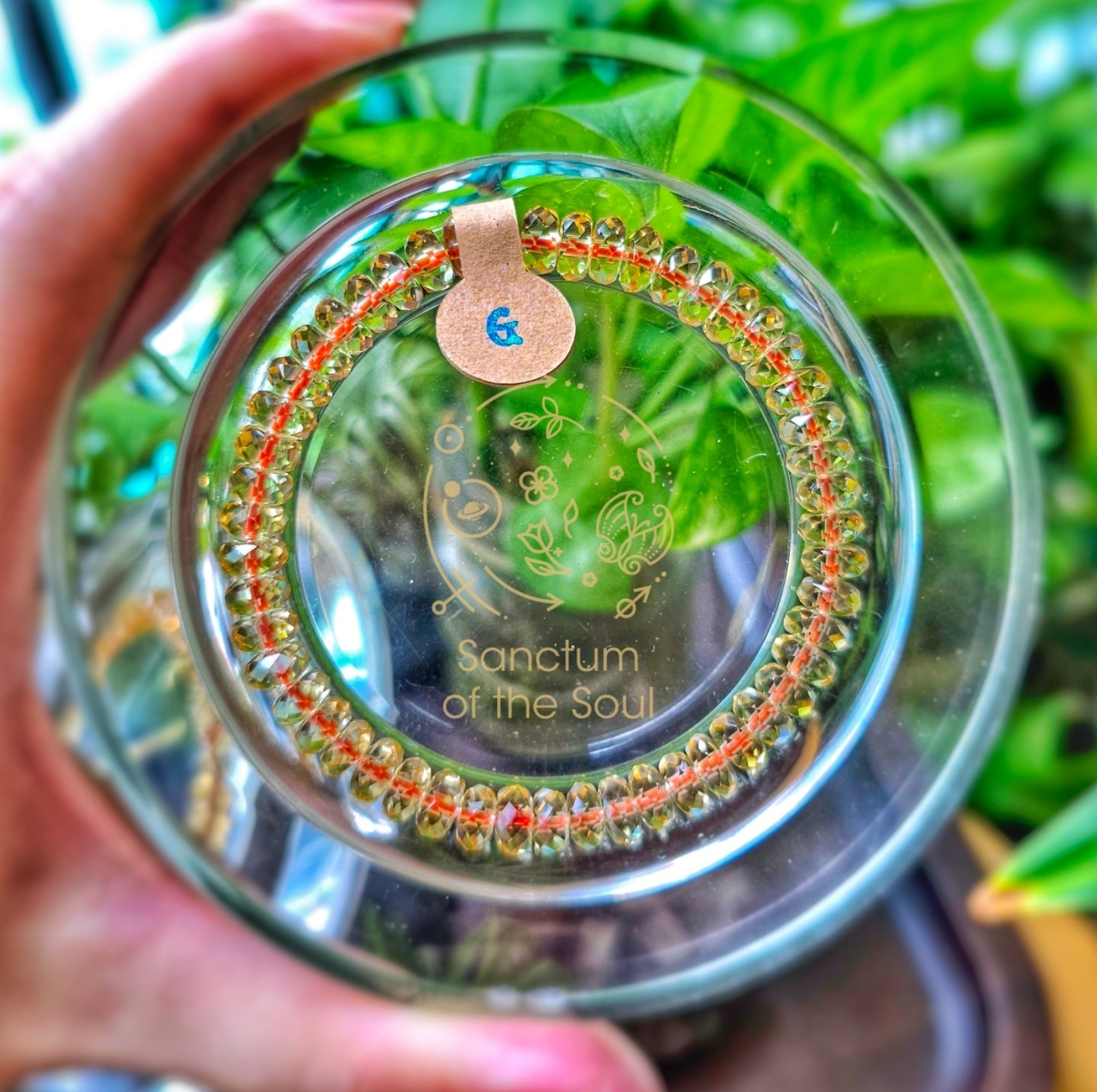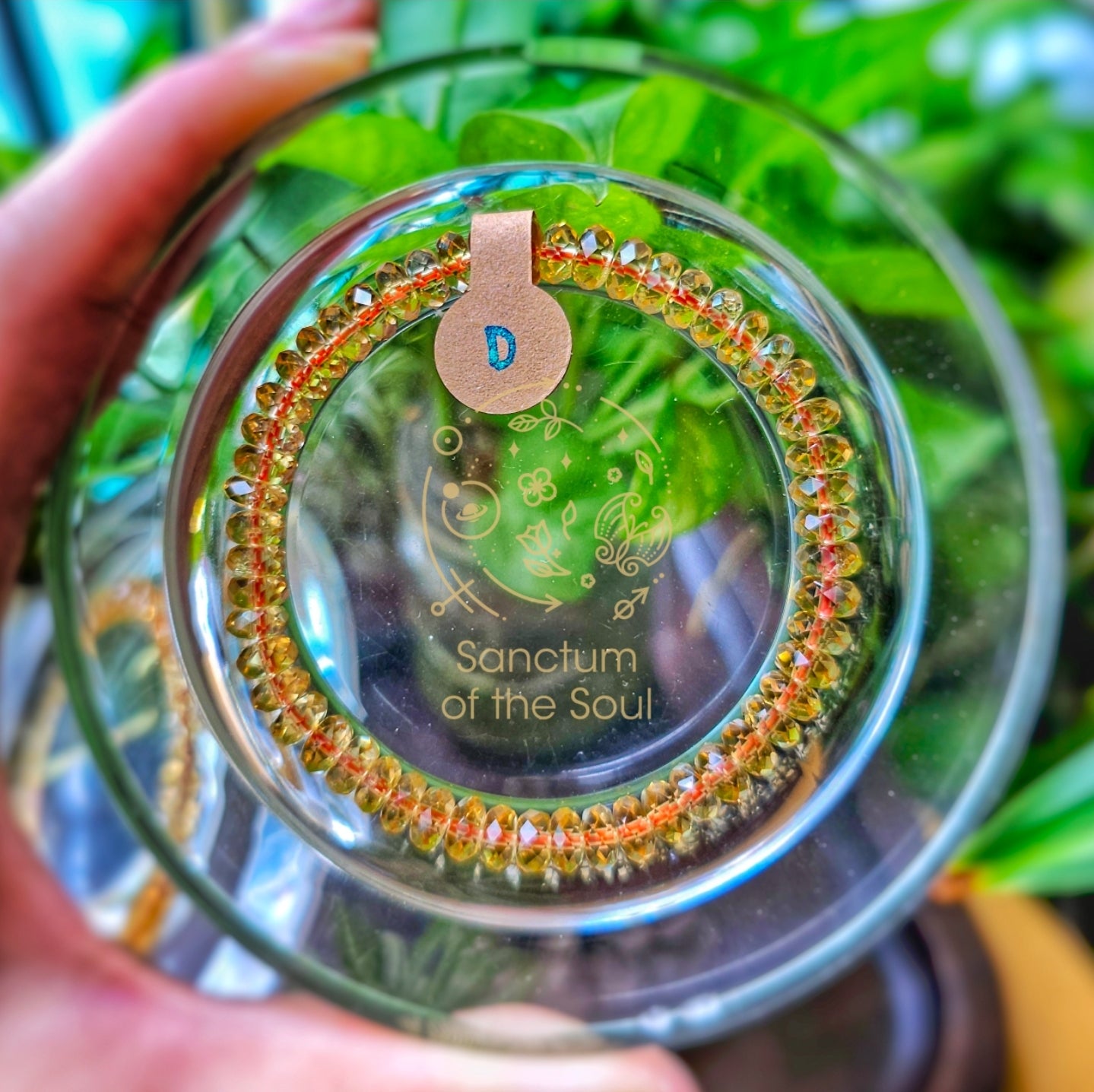Gem faceted Citrine tied with red string.